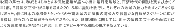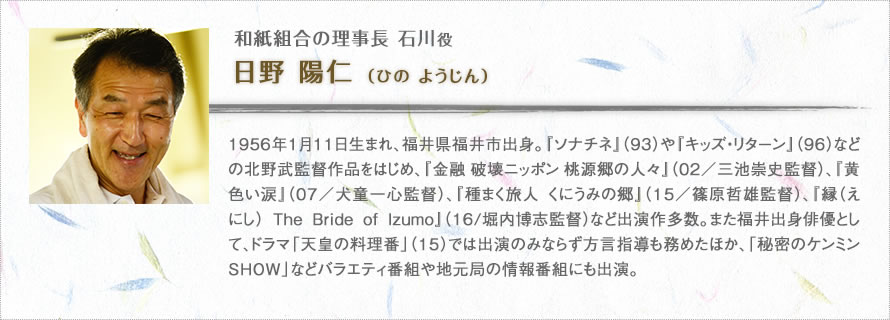 僕たちが初めて「越前和紙の里」を訪れた時に紙漉きを実演してくださったのが、田中老人役で出演している伝統工芸士の玉村久さんです。石倉三郎さんの技術指導と手の吹き替えもしていただきました。紙漉きの作業は想像を絶するほどの繊細さが要求されます。そんな中で均一な和紙を作り続ける職人さんの精神力、忍耐力に感銘を受けました。また工房を案内してくださった和紙組合の石川浩理事長はその後、福井ロケで全面的に協力していただきました。