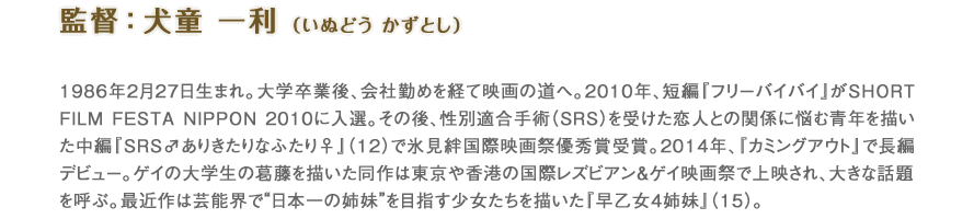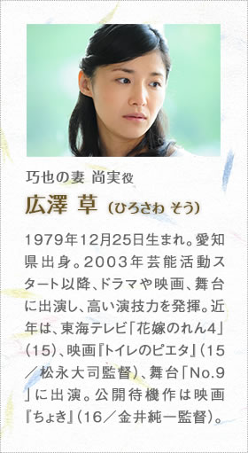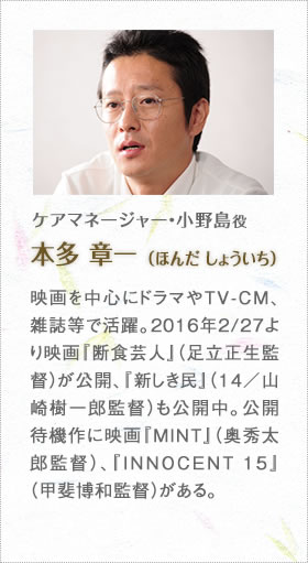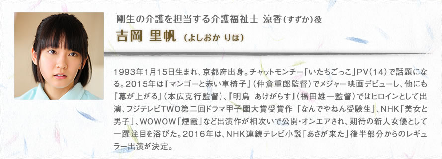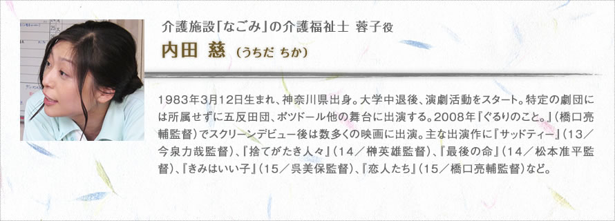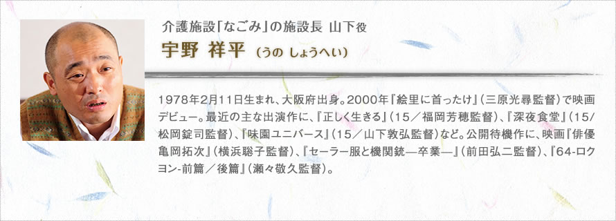新人介護士の涼香役は、いわばこの映画における介護業界の顔です。観客の誰もが応援したくなる雰囲気を持った人を探して、吉岡里帆さんに決まりました。吉岡さんは僕や製作陣が想像していた以上に介護を身近な問題として捉えていて、施設への取材などにも非常に熱心に取り組んでくれました。吉岡さんのみならず、内田慈さん、宇野祥平さんといった「なごみ」のスタッフ役のキャストの方達には、かなり本格的に介護職の役作りをしてもらっています。また本物の介護施設で撮影した「なごみ」のシーンでは、エキストラとして出演してもらった本職の介護士さんたちに一つひとつの所作をチェックしてもらい、リアルさを追求しました。