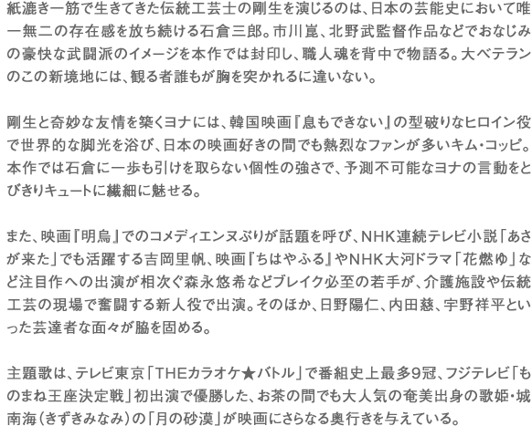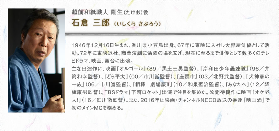 石倉さんの職人気質で孤高のイメージが、紙漉き一筋で生きてきて、倒れても人の手を借りたくない剛生のキャラクターにぴったり合いました。ただし石倉さんは誰に対しても分け隔てなく接する方なので、その点においては外国人に偏見を持っている剛生とは正反対ですね。また、石倉さんといえば豪快でエネルギッシュな印象が強いですが、この作品では剛生の生き様を寡黙な佇まいを通して表したかったので、リアクションは極力抑えていただきました。他では見られない石倉三郎さんが映っていると思います。