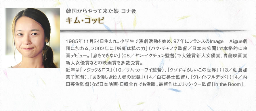 キム・コッピさんは脚本を作っている時から出てもらいたいと思っていました。コッピさんの魅力は、作品やシーンによって別人に見えるほどの表情の豊かさ。劇中でヨナは大きく成長していきますが、各シーンの心情をものすごく的確に表現してくれました。石倉さんが「全部、監督の言う通りにやるよ」と言ってくださったのに対し、コッピさんは自分が100パーセント納得できないと芝居はしないというタイプ。劇中のヨナの気持ちだけでなく、衣装や韓国料理の盛り付け方に関しても少しでも違和感があると指摘してくれるので、リアリティが増したと思います。お芝居に関しても、現場でコッピさんと僕が何十分も意見を交わすことが何度もありました。このように石倉さんとコッピさんの演技のスタンスは正反対で、僕にとっては両方大きなプレッシャーでしたが、お二人の相性は抜群でしたね。