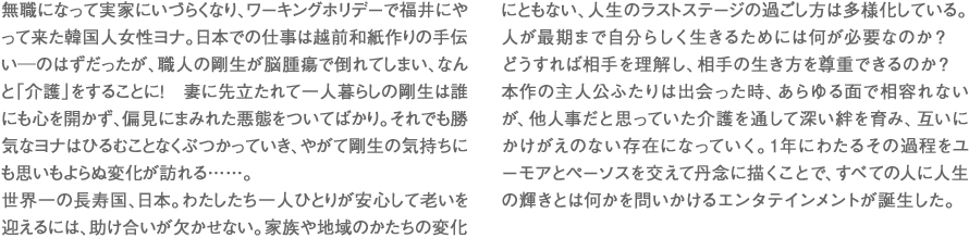 国籍、世代、性別などを超えて「人」と「人」として助け合うことの大切さを感じていただけたら嬉しいです。僕自身、介護を通した交流について最初は頭で考えていた部分がありましたが、取材や撮影を進めるうちにはっきりと実感するようになりました。介護、伝統工芸などの現場にいる人たちのリアルな声を映画に反映することができたと思います。