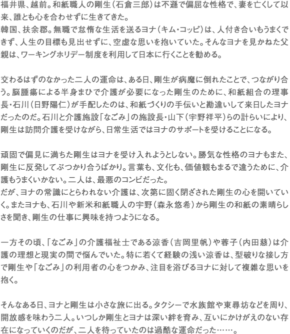 ヨナは剛生の職人としての生き様に触れることで、自分の人生を見つめ直し、新たな一歩を踏み出します。剛生はヨナという理解者と出会い、過ごすことで外国人に対する偏見から解き放たれ、また次世代への継承についても考え始めます。そして過酷な介護現場で忙殺されていた涼香たちも、ヨナと剛生の姿を見て介護の本質に改めて気づきます。映画をご覧になる方々にとって、登場人物たちの心の変化がこれからの超高齢・グローバル社会について考えるきっかけになるといいなと思っています。